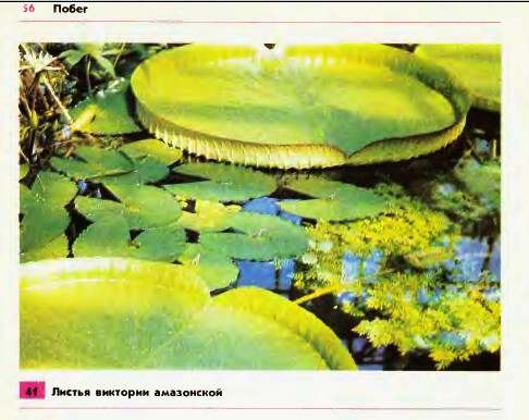 Внешнее строение листьевЛист — часть побега. Познакомимся со строением листа, жизненными процессами, которые в нем протекают, значением листьев в жизни растений. Как не похожи друг на друга листья разных растений! У одних растений листья очень крупные, у других — совсем мелкие. В оранжереях ботанических садов выращивают тропическое водное растение викторию, родственное нашим кувшинкам 41. Лист виктории так велик, что на него, как на плот, может сесть трехлетний ребенок, и лист держит его на воде. А у сорного растения мокрицы листья меньше ногтя. Внешне листья разных растений сильно различаются, но между ними и много общего. Листья большинства растений имеют зеленую окраску и состоят из листовой пластинки и черешка, которым они соединены со стеблем. Такие листья имеют береза, дуб, клен, липа, ясень. У листьев некоторых растений, например столетника, агавы, льна, черешков нет 42. Приходилось ли вам весной среди прошлогодней потемневшей под снегом листвы находить листья, состоящие из одних жилок? Сочные зеленые клетки листовой пластинки сгнили за зиму, а более прочные жилки сохранились. Жилки можно увидеть и на живом листе; на нижней стороне пластинки они заметны лучше, чем на верхней. В листьях некоторых растений жилки расположены параллельно одна другой. Такое жилкование называют параллельным 43. Оно встречается у многих однодольных растений (пшеница, рожь, ячмень, кукуруза, лук и некоторые другие).