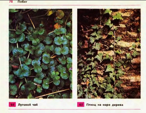 Стебель — составная часть побега. Стебли растений очень разнообразны 63. У большинства растений стебли прямостоячие, они растут прямо вверх. Прямостоячие стебли могут быть одревесневшими или травянистыми. Стебли некоторых растений стелются по земле. Такие стебли могут укореняться в узлах (лапчатка, луговой чай 64). У вьюнка полевого и у фасоли стебли поднимаются вверх, обвиваясь вокруг опоры. Стебли гороха, винограда поднимаются вверх, цепляясь за опору усиками. Стебли плюща цепляются за опору придаточными корнями 65.