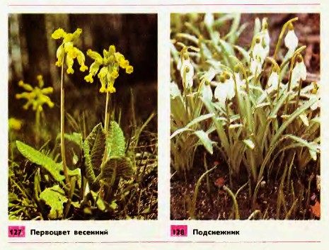 Весна — пора пробуждения природы. По календарю весна начинается 1 марта. В природе весна вступает в свои права с началом сокодвижения у деревьев, на юге раньше, а на севере позднее 1 марта. Весеннее движение соков у деревьев и кустарников — первый признак весны. Оно наступает после того, как оттает почва и вода из корней начнет поступать во все органы растения. В это время листьев еще нет. Вода, скапливаясь в клетках стеблей растений, растворяет запасенные в них органические вещества. Эти растворы передвигаются к набухшим и распускающимся почкам. Уже в начале марта, раньше, чем у других деревьев, начинается весеннее сокодвижение у клена остролистного, чуть позднее — у березы. Второй признак весны — цветение ветроопыляемых деревьев и кустарников. Первой в средней полосе европейской части СССР зацветает ольха серая. Цветки ее невзрачны, но распустившиеся сережки из тычиночных цветков хорошо заметны 123. Стоит только дотронуться до ветки ольхи с сережками, как ветер подхватывает целое облачко желтой пыльцы. Пестичные цветки ольхи собраны в маленькие серовато-зеленые соцветия. Рядом с ними обычно хорошо заметны сухие, почерневшие шишечки прошлогодние соцветия. Почти одновременно с ольхой зацветает орешник, с которым вы знакомились еще осенью. Тычиночные цветки орешника развиваются в соцветиях — сложных сережках, а красноватые рыльца пестичных цветков высовываются из генеративных (цветочных) почек. Раннее цветение ольхи, орешника и других ветроопыляемых растений — хорошее приспособление к жизни в лесу. Голые безлистные ветви не затрудняют опыления. Пыльца, подхваченная ветром, свободно переносится с одного растения на другое. Цветение мать-и-мачехи тоже признак наступившей весны. Это многолетнее травянистое растение растет на открытых, освещенных солнцем местах, на железнодорожных насыпях, берегах рек, крутых склонах и обрывах. Чуть только стает снег, а уже появляются ее чешуйчатые стебли — цветоносы с ярко-желтыми соцветиями, похожими на соцветия одуванчиков 124. Крупные листья мать-и-мачехи вырастают после того, как созреют и рассеются ее пушистые плодики. Свое необычное название мать-и-мачеха получила за своеобразие листьев. Их нижняя сторона покрыта белыми мягкими, как войлок, волосками, а верхняя сторона листьев — гладкая и холодная. Цветение мать-и-мачехи ранней весной, до распускания листьев, возможно потому, что в ее толстых длинных корневищах накоплены запасы питательных веществ, отложенных еще летом прошлого года. Питаясь этими запасами, растут цветочные побеги и образуются плоды. Третий признак весны — цветение многолетних травянистых растений лиственного леса. В районах средней полосы они цветут почти одновременно с мать-и-мачехой. Первыми в лесу зацветают печеночница благородная с лазоревыми цветками и медуница лекарственная, затем ветреницы дубравная и лютичная 125, хохлатки 119, чистяк весенний 126, первоцвет весенний 127. Все они светолюбивы и цветут под пологом леса, когда на деревьях и кустарниках еще нет листвы. В жизни некоторых раннецветущих травянистых растений леса очень интересен их подснежный рост. Такие растения, как пролеска, или подснежник, растут еще зимой под снегом.