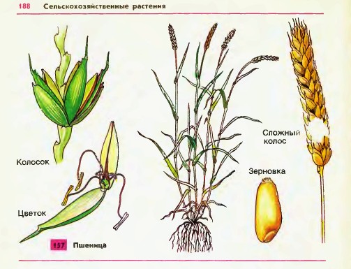 Хлеб — наше бесценное богатство. Хлеб — это труд тех, кто сеет и убирает зерно, кто создает новые сорта зерновых культур, кто строит и вопит сельскохозяйственные машины, кто выпекает хлеб. Берегите хлеб! На земном шаре насчитывают более 20 видов пшениц. Каждый вид имеет много сортов. Однако все виды и сорта пшениц обладают общими признаками. Стебель пшеницы — соломина. На нем хорошо заметны узлы. Одно растение развивает от 2—4 до 12 и более стеблей. листья у пшеницы длинные, узкие, с параллельными жилками; хорошо развиты листовые влагалища. Соцветие — сложный колос. Он состоит из многих колосков. На оси каждого колоска сидят две колосковые чешуи, а за ними — от 2 до 7 цветков 157. Цветок пшеницы имеет типичное для цветков злаков строение: 2 цветковые чешуи, 2 цветковые пленки, 3 тычинки, пестик с двумя рыльцами. В еще закрытых цветках происходит самоопыление. Плод - зерновка. Наибольшее значение имеют пшеницы твердая и мягкая. Эндосперм зерна твердой пшеницы плотный. Если его разрезать, ом блестит, как стекло. Твердую пшеницу высевают ранней весной. Она очень требовательна к почве и климату. Поэтому в России твердые пшеницы разводят главным образом в южных и юго- восточных районах, например на Кубани и в Поволжье, где много тепла и света, а почвы плодородные. Почти на четверть эндосперм зерна твердой пшеницы состоит белка, называемого клейковиной. Обилие клейковины ценится в хлебопечении, особенно при изготовлении макарон. Белый хлеб высшего сорта и лучшие сорта макарон получают из зерна твердой пшеницы. Эндосперм в зерновках мягкой пшеницы рыхлый, мучнистый, менее богатый белками. Мягкая пшеница менее требовательна к почве и теплу. Она распространена почти повсеместно.