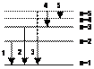 $$$ 227 Суретте көрсетілген сутегі атомы өтулерінің қайсысы сәуле шығару жиілігінің үлкен мәніне сәйкес келеді?