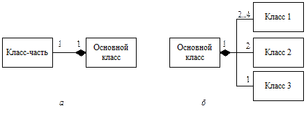 Рисунок 12 - Примеры диаграмм классов, изображающих композицию: с одним объектным полем (а) и несколькими объектными полями различных типов (б) Наполнением называют такое отношение между классами, при котором точное количество объектов одного класса, включаемых в другой класс, не ограничено и может меняться от 0 до достаточно больших значений. Физически наполнение реализуется с использованием указателей на объекты. В отличие от объектного поля, которое включает в класс точно указанное количество объектов (1 или более – при использовании массива объектов или нескольких объектных полей) конкретного класса, использование указателей позволяет включить 0 или более объектов, если они собраны в массив или списковую (линейную или нелинейную) структуру. На диаграмме классов наполнение изображают аналогично композиции, но ромб не закрашивают, показывая более слабую связь объектов классов (см. рисунок 13).