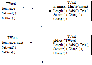 Рисунок 13 - Пример диаграммы классов с наполнением Для определения отношения имеющегося и строящегося классов необходимо выполнить анализ структуры объектов предметной области, полученных в результате объектной декомпозиции. Если объекты предметной области слишком сложны, чтобы ставить им в соответствие некий простой класс, то процесс декомпозиции можно продолжить, выделяя внутри сложных объектов более простые. При этом возможны следующие варианты. 1. Внутри объекта можно выделить объект близкого назначения, но с более простой структурой и/или поведением – класс для реализации данного объекта следует строить на базе более простого, используя наследование. Если при этом объекты строящего класса отличаются от объектов базового класса некоторыми аспектами поведения, то следует изменить поведение объектов строящего класса при наследовании, используя полиморфное наследование с переопределение методов. 2. Внутри объекта можно выделить определенное количество объектов более простой структуры со своим поведением – класс конструируется объединением объектов других классов с добавлением полей и методов строящегося класса – композиция классов. 3. Внутри объекта можно выделить заранее не предсказуемое количество объектов более простой структуры со своим поведением – класс конструируется с возможностью динамического подключения объектов других классов (наполнение) и добавлением полей и методов строящегося класса. Рассмотрим два примера. Пример 6. Разработать класс для реализации объекта «Текст», который должен: · для каждого слова некоторой последовательности слов хранить его атрибуты (тип шрифта и размер букв); · определять количество слов в тексте; · добавлять слова после слов с указанными номерами; · удалять заданные слова из теста; · менять местами слова с заданными номерами; · заменять одно заданное слово на другое во всем тексте; · позволять переопределять атрибуты слова с заданным номером. Итак, реализуемый объект должен оперировать с некоторыми внутренними объектами «Словами», для которых можно определить собственное состояние и поведение. Естественно создать специальный класс TWord для реализации «Слов». Класс TText для реализации «Текста» может быть построен как с использованием композиции, так и с использованием наполнения. В первом случае он должен включать массив объектов класса TWord. Максимальное количество элементов массива должно быть определено заранее и, следовательно, ограничено (см. рисунок 14, а). При выполнении операций удаления и вставки придется сдвигать и раздвигать элементы массива. Во втором случае класс TText должен включать список объектов класса TWord (см. рисунок 14, б). Ограничения предыдущей реализации будут сняты, но реализация со списком имеет несколько большую трудоемкость, и, кроме того, при обращении к слову по номеру придется каждый раз последовательно отсчитывать нужный элемент. Выбор конкретного варианта реализации зависит от условий решаемой задачи.