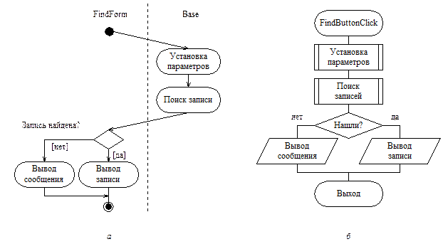 Рисунок 26 - Диаграммы последовательностей действий при выполнении функций: а – создать/открыть книжку; б – записать телефон; в – найти телефон Для метода, обрабатывающего событие FindButtonClick(), приведем диаграмму деятельности с уточнением ответственности объектов (см. рисунок 27, а) и схему алгоритма (см. рисунок 27, б). Сравнение показывает очевидное сходство этих схем, хотя, как уже упоминалось ранее, диаграмма деятельностей более информативна. В качестве упражнения сравните эту диаграмму также с диаграммой состояний формы FindForm (см. рисунок 24) и диаграммой последовательностей действий для функции Найти (см. рисунок 26, в). Хорошо видно, что данные диаграммы уточняют друг друга.