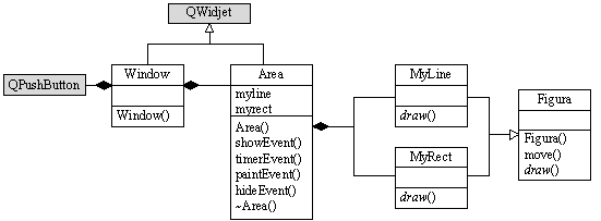 Рисунок 29 – Диаграмма объектов приложения Для уточнения взаимодействия объектов построим диаграмму последовательностей (см. рисунок 30). Реализация объектов потребует использования классов и соответственно разработки диаграммы классов. Классы Окна (Window) и Холста (Area) наследуем от класса QWidget. Класс Кнопки (QPushButton) используем непосредственно. Классы Линии (MyLine) и Квадрата (MySquare) наследуем от абстрактного класса Figura, содержащего общие поля и методы вращающихся фигур. Для реализации Таймера класс создавать не надо. В результате получаем диаграмму классов, представленную на рисунке 31.