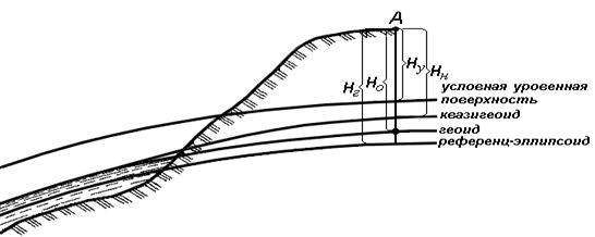Рисунок 15 - Системы высот в геодезии Ортометрическая (абсолютная) высота Hо – расстояние, отсчитываемое по направлению отвесной линии от поверхности геоида до данной точки. Геодезическая высота Hг – расстояние, отсчитываемое по направлению нормали от поверхности референц-эллипсоида до данной точки. В нашей стране все высоты реперов государственной нивелирной сети определены в нормальной системе высот. Это связано с тем, что положение геоида под материками определить сложно. Поэтому с конца 40-х годов в СССР было принято решение не применять ортометрическую систему высот. В нормальной системе высот отметка точки H н отсчитывается по направлению отвесной линии от поверхности квазигеоида, близкой к поверхности геоида. Квазигеоид («якобы геоид») – фигура, предложенная в 1950-х г.г. советским учёным М.С. Молоденским в качестве строгого решения задачи определения фигуры Земли. Квазигеоид определяется по измеренным значениям потенциалов силы тяжести согласно положениям теории М.С. Молоденского. В нашей стране все высоты реперов государственной нивелирной сети определены в нормальной системе высот. Это связано с тем, что положение геоида под материками определить сложно. Поэтому с конца 40-х годов в СССР было принято решение не применять ортометрическую систему высот. В России абсолютные высоты точек определяются в Балтийской системе высот (БСВ) относительно нуля Кронштадтского футштока – горизонтальной черты на медной пластине, прикрепленной к устою моста через обводной канал в г. Кронштадте. Относительная высота Hу – измеряется от любой другой поверхности, а не от основной уровенной поверхности. Местная система высот – Тихоокеанская, её уровенная поверхность ниже нуля Кронштадтского футштока на 1873 мм.