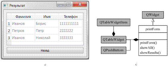 Рисунок 7 – Внешний вид (а) и диаграмма классов (б) формы вывода записей на экран Оба класса предлагают большое количество методов, позволяющих создавать на экране таблицы с текстовой и графической информацией, а также выводить и вводить из них данные [2]. В рассматриваемом примере таблица используется только для вывода результатов, поэтому объекты класса ячейки создаются с флагами Qt::NoItemFlags, запрещающими не только изменение, но и выделение ячеек. Описание класса помещаем в файл printForm.h: #ifndef printForm_h #define printForm_h #include "bookFile.h" #include <QtGui> class printForm: public QWidget { QTextCodec *codec; QTableWidget *table; // указатель на класс таблицы QPushButton *btnExit; void showRow(int i,recType r);// вывод строки таблицы public: printForm(); // конструктор void showAll(); // показать все записи void showResults(recType r1); // показать результаты поиска }; #endif