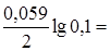 К Zn2++2ē ® Zn ЭДС гальванического элемента Е = jК - jА = -0,76-(-2,37) = 1,61 В. Величина lg K равн.= Потенциируя это уравнение, находим К = 3,5·1054. Поскольку К >> 1, то суммарная реакция протекает самопроизвольно в прямом направлении и практически необратима. Пример 2. Составьте схему гальванического элемента, состоящего из цинкового и серебряного электродов, погруженных в растворы их солей с концентрациями ионов: СZn2+ = 0,1 моль/л, СAg+ = 0,01 моль/л. Укажите катод и анод. Напишите уравнения реакций, протекающих на данных электродах, а также суммарное уравнение реакции в гальваническом элементе. Рассчитайте ЭДС элемента. Решение. Так как концентрации ионов не равны единице, то вначале рассчитаем потенциалы электродов, используя формулу Нернста. Если в условии задачи отсутствуют значения температуры, то её принимают равной стандартной температуре Т = 298 К. Поэтому будем использовать уравнение (30): j = j 0 + Подставим числовые значения в эту формулу, используя данные табл. 6: j Zn/Zn2+= -0,76 + j Ag/Ag+= 0,80 + Из расчета видно, что jZn/Zn2+< jAg/Ag+.Поэтому цинковый электрод является анодом, а серебряный – катодом.