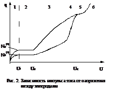 Счетчик состоит из цилиндрического корпуса 1 (катод), по оси которого натянута тонкая нить 2 (анод). Нить изолирована от корпуса с помощью изоляторов 3. Для впуска ионизирующих частиц с малой проникающей способностью один из торцов счетчика делается из слюды или алюминиевой фольги. Другие частицы, а также рентгеновское и γ -излучение проникают в счетчик непосредственно через стенки.Между анодом и катодом с помощью батареи 4 создается разность потенциалов U. Пространство внутри корпуса 1 заполнено газом. Принцип действия прибора состоит в следующем: пусть газ, находящийся между катодом и анодом, подвергается действию ионизатора (например, рентгеновских лучей). Действие ионизатора приводит к тому, что от некоторых молекул газа отщепляется один или несколько электронов, в результате чего эти молекулы превращаются в положительно заряженные ионы. Ионы и отщепленные электроны увлекаются полем к электродам, вследствие чего через сопротивление R проходит некоторый заряд q, который называется импульсом тока. На рис. 2. Приведена зависимость импульса тока q от напряжения между электродами U для двух различных количеств пар первичных ионов N0(1) и N0(2), причём N0(1)<N0(2). В области 1 имеют место два конкурирующих процесса: собирание заряда на электродах счетчика и рекомбинация ионов в газовом объеме. При возрастании напряжения U скорость движения ионов увеличивается, вероятность рекомбинации уменьшается и величина заряда, собранного на электродах, растет.