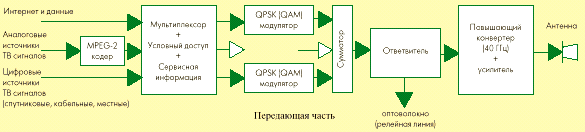 Раздача сигнала к сотовым передатчикам может производиться по оптоволокну, маломощным релейным линиям или с помощью самой MVDS. У абонента устанавливается антенна, монтируемая на стене здания, малошумящий конвертер и стандартный ресивер. Для приема могут использоваться антенны различной конструкции - рупорные, микрополосковые или параболические. Рис.17. Экспериментальный LNB MVDS Сигналы миллиметрового диапазона практически не подвержены импульсным помехам и шумам ингрессии, которые могут создавать большие проблемы при приеме сигналов эфирного диапазона. Основной источник возможных помех — это отраженные сигналы собственного передатчика. Чтобы максимально застраховаться от нежелательного приема отраженных сигналов, используют приемные антенны с диаграммой направленности шириной до десятков секунд. Для волн миллиметрового диапазона такую узкую диаграмму направленности могут обеспечить антенны совсем небольших размеров. Перенос частоты из миллиметровой области в дециметровую проводится в один или два этапа. При этом возможны проблемы из-за высокой абсолютной нестабильности высокочастотного гетеродина конвертера и сильного ухода передаваемого сигнала. Их решением может быть стабилизация частоты гетеродина пилот-сигналом, вводимым на передающей стороне в общий поток. Этот принцип используется, например, в системах Technosystem, совместимых со стандартом DVB-С. Конвертация сигнала на передающей стороне производится в два этапа. Сперва частота переносится в область 2.3-3.3 ГГц. На этом этапе используется фазовая автоподстройка частоты гетеродина конвертера и ввод пилот-сигнала, синхронизируемого по фазе тем же высокостабильным источником. На втором этапе частота переносится в область 40 ГГц. На приемной стороне конвертация сигнала происходит в обратной последовательности — сперва частота переносится в область 2.3-3.3 ГГц, после чего поступает во второй конвертер с фазовой автоподстройкой, где в качестве опорного используется пилот-сигнал, введенный на передающей стороне. При отсутствии обратного канала, затраты на абонентское оборудование относительно невелики. Стоимость наружного блока не превышает $100. К нему добавляется стоимость стандартного кабельного или спутникового цифрового ресивера. Стоимость абонентского оборудования с обратным каналом значительно выше, так как оно включает дорогой трансивер — интегрированный внешний приемо-передающий блок. Стандарт на организацию обратного канала в системах MVDS еще не принят, и информации об испытаниях двунаправленных систем очень мало. Судя по всему, с работой таких систем пока имеются проблемы технического характера. Возможно, они связаны со сложностью синхронизации обратных потоков, поступающих от разных абонентов. Однако все оборудование для двухсторонних систем уже существует, и его массовая эксплуатация, видимо, является вопросом недалекого будущего.