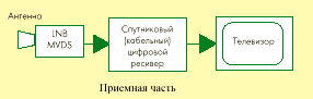 На рисунке изображена типичная структурная схема передающей и приемной частей системы MVDS. После формирования цифровых пакетов, каналы модулируются и объединяются для подачи к широкополосным передатчикам. Возможно также использование индивидуальных передатчиков. В передатчике спектр сигнала переносится в область 40 ГГц (это происходит за один или два этапа), усиливается и передается к антенне. Базовые станции могут оборудоваться набором секторных антенн. Это позволяет усилить мощность передаваемого сигнала, а также увеличить количество абонентов за счет повторного использования частоты и смены поляризации.