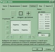 С целью выделения отдельных элементов таблицы (заголовок колонок, строк, ячеек) используется режим обрамления. Для этого выполняются следующие действия: - выделяются ячейки, подлежащие выделению; - выбирается команда «Формат Ячеек»; - в диалоговом окне «Формат ячейки» выбирается закладка «Граница»; - выбирается цвет линии, тип линии, признак «Внешнее» и «Внутренние». Вид диалогового окна для обрамления таблицы рисунок 3.