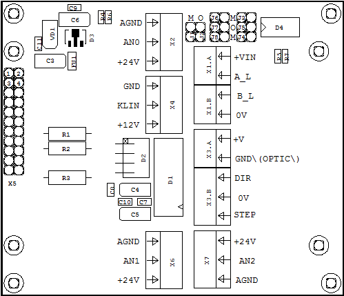 Перемычки J1,J2 определяют напряжение питания, а J3-J6 определяют наличие гальванической развязки по входам датчика углового перемещения лебедки. Этот датчик подключается к разъемам X3.A,B. Конкретные схемы подключения и соответствующая им установка перемычек J1-J6 указана в описании на соответствующий датчик в данном Руководстве. Подключение производится кабелем, введенным в корпус контроллера через гермоввод. Токовый датчик веса на крюке ДНК 311-03 подключается к разъему X6. Токовый датчик положения клиньев ДПК 314-01А подключается к разъему X7, а дискретный (ДПК 314-01Д) – к X4. Подключение этих датчиков приведено в документации на соответствующие изделия и производится через герметичные разъемы, установленные на корпусе контроллера глубиномера. Разъем X2 может быть использован для подключения токового датчика давления в манифольде. В текущей версии конструктивного исполнения глубиномера и конфигурации станции ГТИ эта возможность не используется. К разъему X1.A, X1.B подключается кабель от системы сбора. К контактам 0V и VIN подключается соответственно нулевой и питающий проводники. К контактам A_L и B_L подключаются проводники витой пары интерфейса RS-485 соответственно RS485-A и RS485-B. Подключение производится через разъем, установленный на корпусе контроллера.