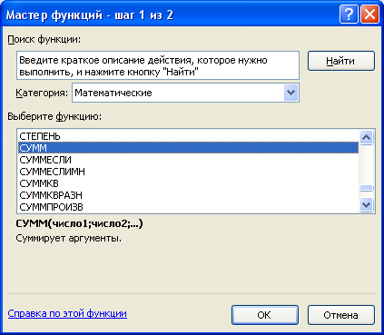 Вставка стандартных функций Данную процедуру опишем на примере использования функции сумм. Для вставки стандартной функции необходимо: · Курсор установить на ячейку, в которую требуется вставить функцию. · Выбрать Формулы, нажать пиктограмму · Курсором в поле Категория выбрать группу. Например, Математические. · В поле функции выбрать СУММ, нажать «ОК».