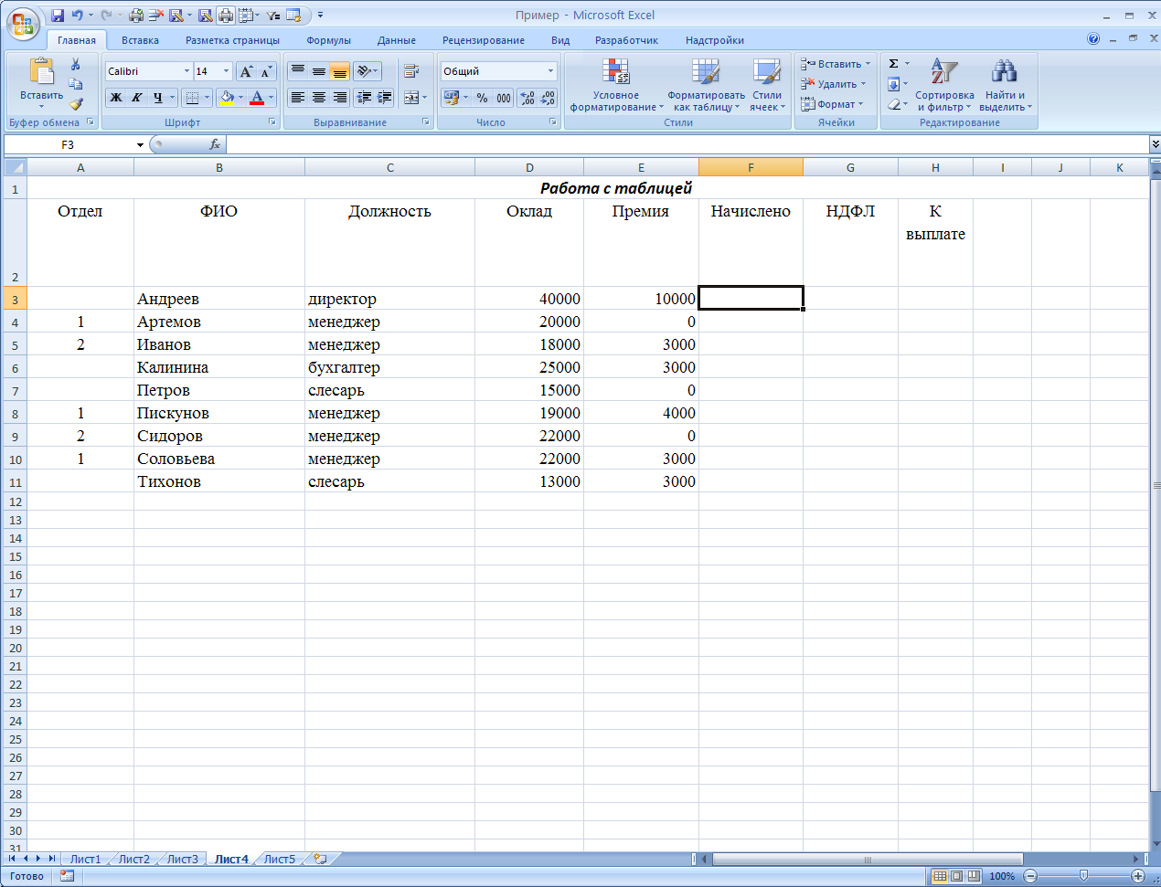 Задание №2а. Вычислить сумму оклада и премии. Результат разместить в столбец “Начислено”.