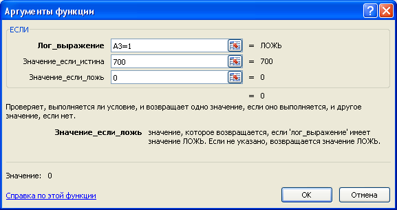 · В поле Логическое_выражение ввести с клавиатуры значения аргументов. В данном случае A3=1. · В поле Значение_если_ истина ввести с клавиатуры значение 700.