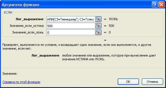 · В поле Логическое_выражение ввести с клавиатуры значения аргументов. В данном случае ИЛИ(C3= «менеджер»;С3= «слесарь»). · В поле Значение_если_ истина ввести с клавиатуры значение 500.