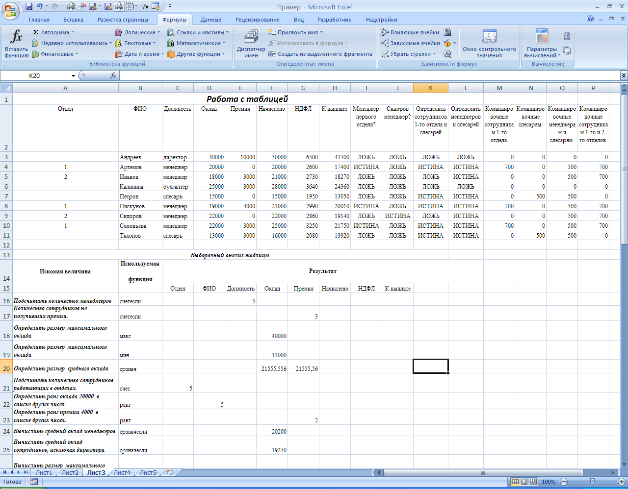 Синтаксис ИЛИ (логическое_значение1;логическое_значение2;...) Логическое_значение1, логическое_значение2,... — от 1 до 255 проверяемых условий, которые могут иметь значение либо ИСТИНА, либо ЛОЖЬ. Задание № а Определить сотрудников первого отдела и слесарей. Для вставки стандартной функции необходимо: · Курсор установить на ячейку, в которую требуется вставить функцию. В данном случае курсор устанавливаем на ячейку K3. · Выбрать Формулы, нажать пиктограмму Курсором в поле Категория выбрать группу. В данном случае – Логические. В поле функции выбрать ИЛИ, нажать «ОК · В поле Логическое_значение1ввести с клавиатуры значения аргументов. В данном случае A3=1. · В поле Логическое_значение2ввести с клавиатуры значения аргументов. В данном случае C3="слесарь", нажать «ОК». Результат скопировать в диапазон K3:K11. Задание № б Определить менеджеров и слесарей.