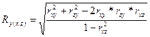 При определении тесноты связи для множественной зависимости пользуются коэффициентом множественной (совокупной) корреляции, предварительно исчислив коэффициенты парной корреляции. Так, при изучении связи между результативным признаком у и двумя факторными признаками — х и z, нужно предварительно определить тесноту связи между у и х, между у и z, т.е. вычислить коэффициенты парной корреляции, а затем для определения тесноты связи результативного признака от двух факторных исчислить коэффициент множественной корреляции по следующей формуле: