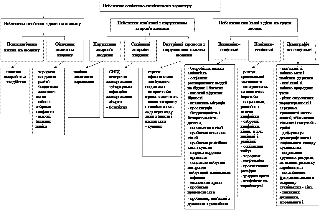 Соціальні небезпеки дуже численні, тому при класифікації їх ділять на класи і типи (див. схему 1.). 1-й клас - Небезпеки пов'язані з дією на людину, яка ділиться на наступні типи: - Небезпеки, пов'язані з психологічною дією на людину: - шантаж; - шахрайство; - крадійство і ін. - Небезпеки, пов'язані з фізичною дією на людину: - тероризм; - вандалізм; - розбій; - бандитизм; - заложничество; - війни і озброєні конфлікти; - масові безлади, паніка. 2-й клас - Небезпеки пов'язані з порушенням здоров'я людини, які діляться на наступні типи: - Небезпеки, пов'язані із вживанням речовин, що руйнують організм людини; - паління; - алкоголізм; - наркоманія. - Небезпеки, пов'язані з соціальними хворобами: - СНІД; - венеричні захворювання; - туберкульоз; - інфекційні захворювання; - аборти; - безпліддя. - Небезпеки, пов'язані з внутрішніми процесами, що порушують психіку людини: - стреси; - ефектні стани; - зомбування свідомості; - інтернет або ігрова залежність; - вплив інтернету і телебачення в ході перегляду актів вбивств і насильства; - суїциди. 3-й клас - Небезпеки пов'язані з дією на групи людей, які діляться на наступні типи: - Економіко-соціальні: - безробіття, низька зайнятість; - соціальне розшарування людей на бідних і багатих; - високий відсоток бідності; - незаконна міграція; - проституція; - безпритульність в т.ч. дитяча, бездоглядність; - насильство в сім'ї; - проблеми неповних сімей; - проблеми релігійних сект і культів; - широка корупція; - кримінал; - соціально-побутові негаразди; - побутовий націоналізм; - інфляція; - економічні кризи; - проблеми продовольства; - проблеми, пов'язані з духовним і релігійним рівнем. - Політико - соціальні: - розгул кримінальної злочинності; - екстремістська політична боротьба; - національні, релігійні і етнічні конфлікти; - озброєні конфлікти, війни, в т.ч. цивільні і релігійні; - соціальний вибух; - тероризм; - націоналізм; - протистояння розвідок; - урядова криза; - конфлікти на виробництві (страйк, саботаж). - Демографічно-соціальні: - пов'язані зі зміною меж і політики держави; - пов'язані зі зміною природних умов; - різке скорочення народжуваності і середньої тривалості життя людей зі збільшенням кількості смертей в країні; - деформація демографічного і соціального складу суспільства; - підривання трудових ресурсів, як основи розвитку виробництва; - послаблення фундаментального осередку суспільства - сім'ї; - зниження духовного, морального і творчого потенціалу.