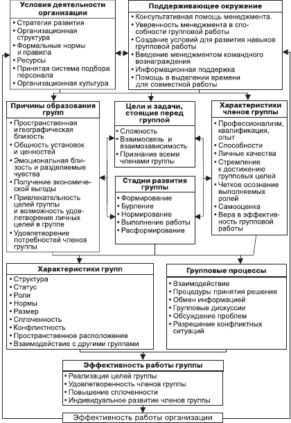 Эффективность групповой деятельности зависит от ряда факторов (рис. 5.6.1). На эффективность влияют условия деятельности групп, определяемые организацией. Например, стратегия развития организации определяет стратегию функционирования групп, входящих в ее состав. Если предполагается реорганизация производства, то в подразделениях, которых она будет касаться, увеличивается беспокойство сотрудников, создаются потенциальные причины для конфликтов. Организационная структура организации определяет место каждого подразделения в системе управления, его взаимоотношения с другими подразделениями в процессе совместного труда. Деятельность групп, исходя из занимаемого положения в структуре организации и в соответствии с формальными ее нормами и правилами, будет относительно предсказуемой. Степень обеспеченности предопределяет взаимоотношения групп между собой по поводу распределения или перераспределения ресурсов, что также влияет на эффективность работы групп в организации. Если организация поддерживает коллективный стиль работы, то при подборе персонала на вакантные должности предпочтение отдается кандидатам, которые обладают навыками командной работы.