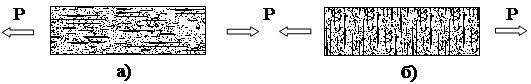 Рис. 1.6. Фотоотпечатки двух осей, вырезанных из проката в разных направлениях (схема): а – вдоль проката; б – поперек проката Предположим, что данные оси работают в условиях одноосного растяжения. Сульфидные включения, имеющие вытянутую форму с острыми концами, являются концентраторами напряжений, т.е. условными «трещинами». Если приложенное усилие перпендикулярно сульфидным строкам, то эта «трещина» раскрывается, а в их вершинах происходит еще большая концентрация напряжений, которые в конечном итоге могут превысить предел прочности стали и вызвать разрушение данной оси. В случае расположения сульфидных строк параллельно действию нагрузки «трещина» не раскрывается, а, напротив, закрывается. Таким образом, можно заключить, что ось, вырезанная в поперечном направлении проката, будет иметь меньшую прочность и изготовлена неправильно. Очевидно, что расположение сульфидной строчечности в стали по отношению к растягивающим напряжениям имеет большое значение и определяет прочность всего изделия в целом в независимости от его формы, т.к. предел прочности стали в направлении проката выше, чем в поперечном прокату направлении. Такая неодинаковость прочностных свойств стальной заготовки (детали) по разным направлениям проката называется анизотропией.
