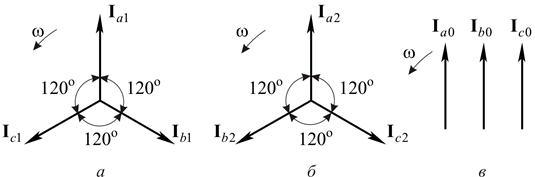 Рис. 5.1. Симметричная система токов прямой (а), обратной (б) и нулевой (в) последовательностей
