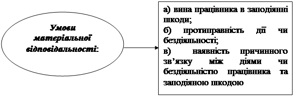 2. певні підстави та умови (підстави – порушення працівником трудових обов’язків і заподіяння шкоди, а умови – вина, протиправність поведінки і причинний зв’язок);