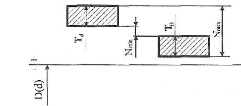 Рисунок 2 - Схема розташування полів допусків отвору øD Поняття про з’єднання і посадки. Класифікація з’єднання Характер з'єднання деталей, що визначається величиною отриманих в ньому зазорів чи натягів, називається посадкою. Посадка характеризує свободу відносного переміщення деталей, що з'єднуються, або степінь опору їхньому взаємному зміщенню. В залежності від взаємного розташування полів допусків отвору і вала розрізняють посадки з зазором, натягом та перехідні. Зазор S - різниця розмірів отвору і вала, якщо розмір отвору більше розміру вала. Натяг N - різниця розмірів вала і отвору до складання, якщо розмір вала більше розміру отвору. Посадкою з зазором називається посадка, при якій забезпечується зазор у з'єднанні. В цій посадці поле допуску отвору Т D розміщене над полем допуску вала Т d (рисунок 3). На кресленнях з'єднання вала з отвором відхилення позначають рядом з номінальним розміром дробом, в чисельнику якого вказують граничні відхилення отвору, а в знаменнику - граничні відхилення для вала, наприклад: