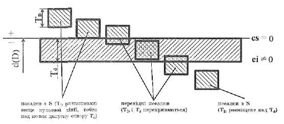 Рисунок 5 -Схема розташування полів допусків перехідних посадок Контрольні запитання для самоконтролю 1 Єдина система допусків і посадок (ЕСДП) 2 Дати визначення дійсного, номінального та граничного 3 Дати визначення дійсного, номінального та граничного 4 Охарактеризувати поняття "вал" і "отвір". 5 Що таке допуск розміру і допуск граничного відхилення 6 Ряди нормальних розмірів 7 Інтервали нормальних розмірів 8 Що таке поле допуску? 9 Що таке посадка7 10 Три типи з’єднання 11 Характери посадок