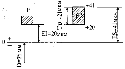 Рисунок 9 – Поля допусків отворів Приклад: D = ø25F7; D = 25 мм - номінальний розмір; основні відхилення - ЕІ = +20 мкм; ЕS = 41 мкм; допуск Т D =21 мкм (для q = 7 квалітету та інтервалу розмірів вище 18 до ЗО). Схема розташування поля допуску ø25F7 дана на рисунку 10