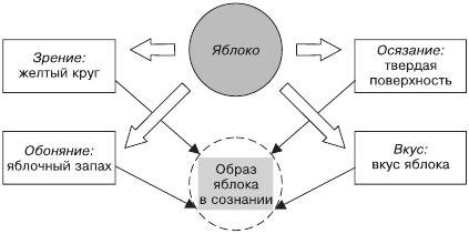 Например, восприятие яблока складывается из зрительного ощущения зеленого круга, тактильного ощущения гладкой, твердой и прохладной поверхности и обонятельного ощущения характерного яблочного запаха. Складываясь вместе, эти три ощущения дают нам возможность восприятия целого предмета – яблока.