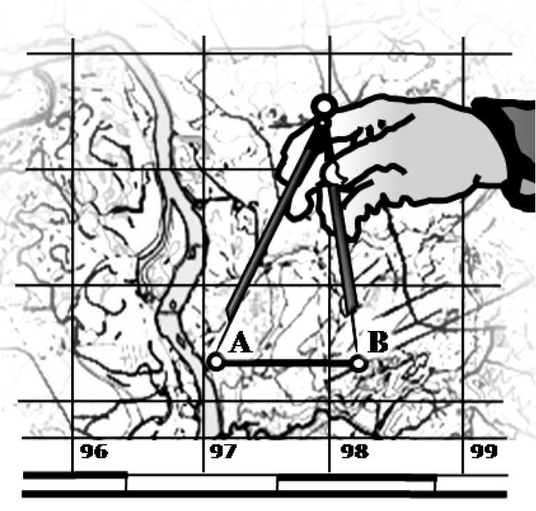 Задание 1. 1.1. Определение расстояния между точками А и В с помощью численного масштаба выполняется в следующей последовательности: миллиметровой линейкой измеряют расстояние между точками А и В и, пользуясь численным масштабом, определяют истинное расстояние между точками. Например: АВ = 99 мм; масштаб карты – 1:10000;