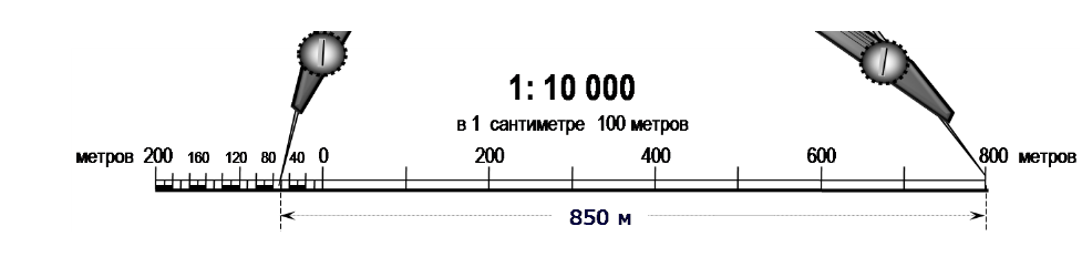 S АВ= 99 • 10 000 = 990 000 мм = 990 м = 0,99 км. 1.2. Определение расстояния между точками А и В с помощью циркуля-измерителя и линейного масштаба (рис. 4, 5) производится в следующей последовательности: а) расстояние АВ менее 200 м. Ножку циркуля устанавливают на значение «0» линейного масштаба. Вторую ножку располагают слева от «0» по миллиметровой шкале. Значение расстояния определяют в виде отсчёта по шкале линейного масштаба; б) расстояние АВ более 800 м, но менее 1 км. Ножку циркуля устанавливают на отсчёт 800 м. Расстояние S АВ = 800 м + Δ S, где ΔS определяют аналогично пункту (а); в) расстояние значительно больше 800 м. В этом случае между точками А и В проводят линию. Раствор циркуля устанавливают равным 800 м. Путём последовательного перемещения ножек циркуля по линии АВ откладывают целое число раз «n» основания масштаба. Оставшуюся часть ΔS, не кратную 800 м, измеряют аналогично пункту (а). Расстояние АВ равно S АВ = n • 800 м + Δ S. 1.3. Аналогично линейному масштабу, используя численный масштаб, определяется расстояние S 3 (рис. 4, 6, 7).