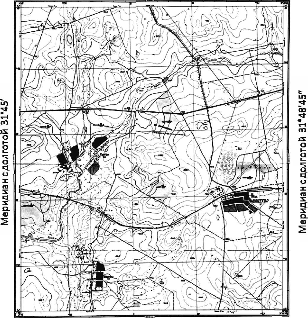 φю = 54°37'30" (рис. 8).Северная и южная линии внутренней рамки листа карты являются параллелями, а западная и восточная меридианами (рис.8). На карте показаны координаты углов рамки широты: 54°37'30'' и 54°40'; и долготы: 31°45'00'' и 31°48'45''.