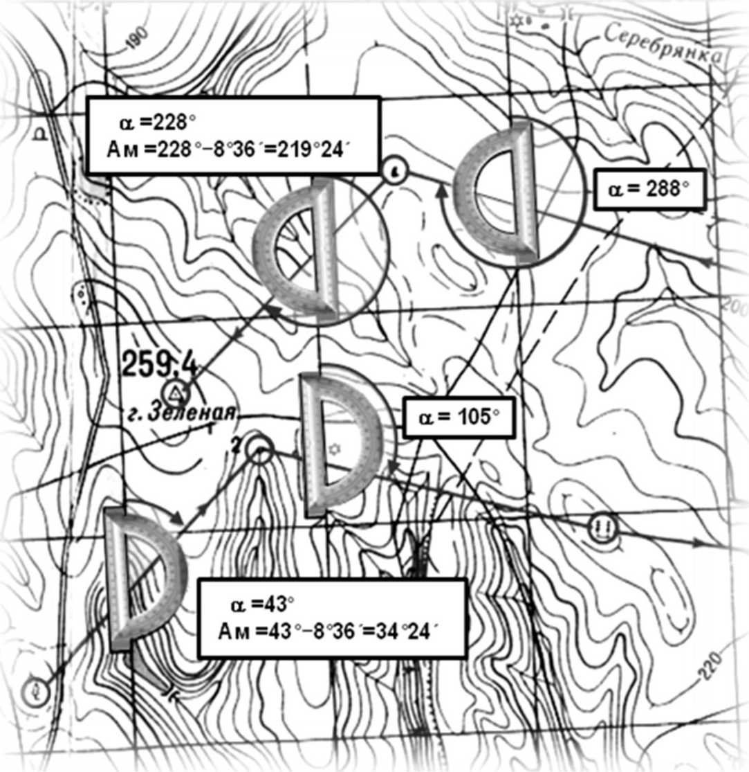 2.3. Нанесение на карту точек E и F с заданными прямоугольными координатами осуществляется в обратном порядке. По заданным значениям координат находят координаты юго-западного угла того квадрата, где должна находиться точка. Полученные разности между координатами этого угла квадрата и координатами точки будут приращения координат ∆х и ∆у. Эти приращения откладываются с учетом масштаба карты по соответствующим осям координат и наносится точка. Задание 3. 3.1. Измерение дирекционного угла производится транспортиром на карте (рис. 9, 11). Центральную метку транспортира устанавливают в любой из точек на линии АВ и ориентируют «0°» шкалы транспортира по северному направлению оси Х - линии, параллельной осевому меридиану (километровой сетки), по ходу часовой стрелки отсчитывают горизонтальный угол до направления линии АВ. 3.2. Определение истинного и магнитного азимута направления АВ производят с помощью схемы ориентирования (рис. 10), помещенной на карте. Например, α АВ = 70 °