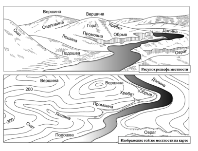 Рис.14. Рельеф местности и его изображение на топографических картах