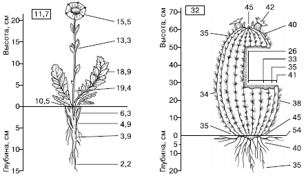 Рис. 14. Температура (в °С) разных органов растений (из В. Лархера, 1978). В рамках дана температура воздуха на высоте растения: A – растение тундры Novosieversia glacialis, Б – кактус Ferocactus wislisenii