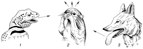 Рис. 17. Испарительная терморегуляция у животных: 1 – ящерица – испарение со слизистых при открытом рте; 2 – антилоповый суслик – натирание слюной; 3 – койот – испарение со слизистых при учащенном дыхании