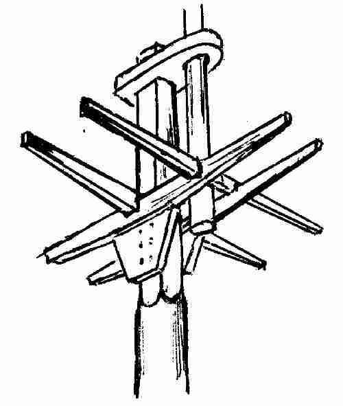– Но это не единственная площадка на большой мачте, – предупредил Мотя. – На следующем стыке, где стеньга соединяется… с чем? – С брам‑стеньгой! – хором сказали четверо приятелей. – Да‑да! Так вот, именно там, тоже на месте нижнего эзельгофта, есть еще одна площадка. Но она легонькая, без настила. Просто рама из лонга‑салингов и краспиц. Оно и понятно – нельзя большую тяжесть поднимать на высоту… Эта рама – САЛИНГ. Отойдем сторону, тогда салинг будет хорошо виден. Вот…