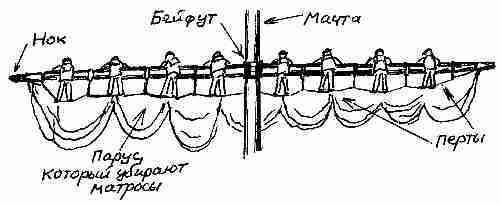 – А что это за трос, который тянется под реем на тонких подвесках? – спросил Слава и приготовился рисовать. – Это ПЕРТ. Матросы у п и р а ю т с я в него, когда работают с парусами. Встают на перт подошвами, ложатся на рей животом и грудью и тянут или распускают парусину. Раньше это была опасная работа. В наше время все матросы, оказавшись на высоте, пристегиваются к рею страховочными поясами… Теперь посмотрите на закругленные концы реев. Называется такой конец НОК. Короткое слово, легко запоминается. Может быть, читали в книжках про пиратов, как грозный капитан кричит пленникам: «Если не скажете, где золото, всех повешу на нока‑рее!» Это не совсем правильное выражение. Следует говорить «на ноке рея»… – Это совсем неправильное выражение!" – возмутилась Ксеня. – Вешать пленников вообще нельзя! Ни на ноке и нигде… – Верно, верно. Однако это ведь не я, а пираты…