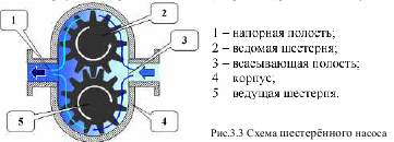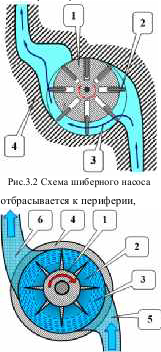 Рис.3.3 Принципиальная схема водокольцевого насоса образуя водяное кольцо 3. Рабочий объём 2 между лопатками ротора сначала увеличивается, а затем уменьшается, за счёт чего происходит всасывание и нагнетание перекачиваемой жидкости. Всасывающий 5 и нагнетательный 6 патрубки насоса примыкают к торцевой части насоса. В корпусе шестерённого насоса 4 (см. рис. 3.4) размещены ведущая 5 и ведомая 2