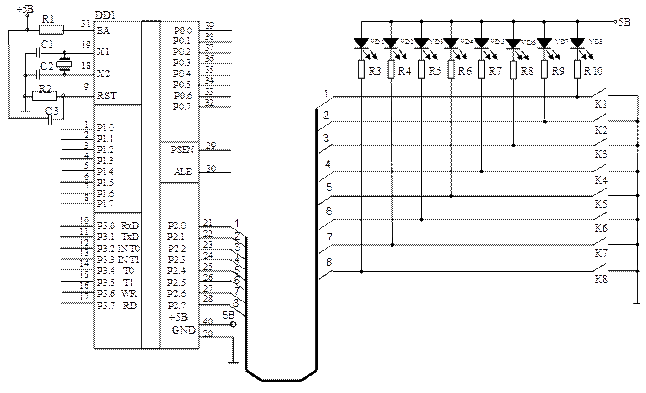 Схема платы блока переключателейпредставлена на рис.23. С его помощью на вход микроконтроллера можно подать любую восьмиразрядную комбинацию из нулей и единиц. Если ключ не замкнут, то от источника питания через диод и резистор на соответствующий разряд порта подается напряжение 5В, что соответствует логической 1. При замыкании ключа по соответствующей цепи источник питания – диод – резистор – ключ – корпус протекает ток. При этом светодиод зажигается, а на вход разряда порта подается низкий потенциал (логический 0). Опрос состояния переключателя: JB P2.3,Met;перейти если бит 3 равен 1 (ключ 4 разомкнут) или JNB P2.3,Met;перейти если бит 3равен 0 (ключ 4 замкнут).