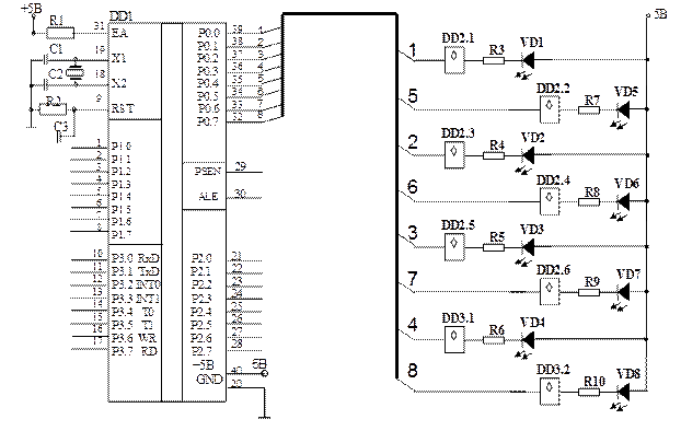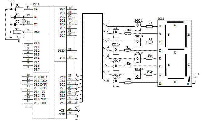 Схема блока приведена на рис. 28. В схеме использован индикатор HL1 с общим анодом. На аноды всех сегментов (светодиодов) индикатора подается напряжение питания +5В. Катоды сегментов через резисторы и буферные элементы с открытым коллектором подключены к порту Р2 микроконтроллера. Для того, чтобы зажечь соответствующий сегмент, на выход порта Р2 необходимо выдать логический 0. При этом откроется выходной транзистор буферного элемента и замкнется цепь питания соответствующего сегмента источник питания – сегмент - резистор – транзистор буферного элемента – корпус, он загорится.