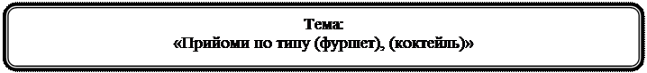 План: 1. Прийом по типу «фуршет», особливості його проведення: - складання меню, - розташування столів, - сервіровка, - порядок подачі гарячих закусок, десерту, вин. 2. Бенкет-коктейль, особливості його проведення: - правила подачі закусок; - особливості подачі коктейлів і напоїв.