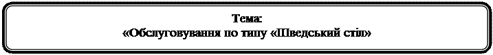 План: 1. Обслуговування по типу «Шведський стіл»: - складання меню, - розташування столів, - сервіровка, - порядок подачі гарячих закусок, десерту, вин. Література: 1. Пятницька Н. О. Організація обслуговування в підприємствах ресторанного господарства, с. 166 - 177. 2. Сало Я.М. Організація обслуговування населення на підприємствах харчування. Ресторанна справа, с. 151 – 162.
