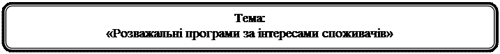 План: 1. Організація музичного обслуговування в закладах ресторанного господарства. Види музичного обслуговування: жива музика, використання музичних автоматів, відео- та аудіо апаратури. 2. Організація розважальних шоу-програм. Розважальні програми за інтересами споживачів: споживачів ресторанів і кафе сімейного типу і споживачів закладів «за інтересами»: казино, кабаре, більярд, боулінг, кегельбан, фітнес-центр тощо.