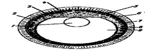 Головка,2-шейка,3-тело,4-хвост,5-мембрана,6-акросома,7-перфаротории,8-ядро,9-центриоль,10-спиральная нить,11-поперечный разрез хвоста,12-продольные нити