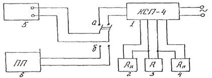 1 – ауыстырмалы потенциометр КП-59; 2 – потенциометр КСП-4; 3 – автотрансформатор; 4 – қосқыш; 5 – амперметр; 6 – үлгілі термопара ХК; 6б – тексерілетін термопара ХА; 6в – тексерілетін термопара ХА +ПП.