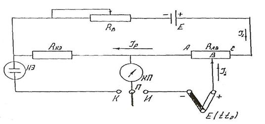 Қосымша жүйеге Вестон элемнті қосылады /ноальді элемент/. Оның ЭҚК=1,01850 В және практикада ұзқ уақыт мерзімінде шамасы өзгермейді. Тоқ көзі Е-ні өлшер алдында Rt реостаты мен жұмысшы тоғы орнатады /ауыстырғыш П, К жағдайына/. Кернеудің кедергідегі төмендегі RНЭ ЭҚК тең болғанша жұмысшы тоғы кедергімен реттелініп отырылады RВ /нормальді элементтің/. Осы жағдайда нуль-прибор көрсеткіші 0-ді көрсетеді. Жұмысшы тоғы мына прибор арқылы өрнектеледі:
